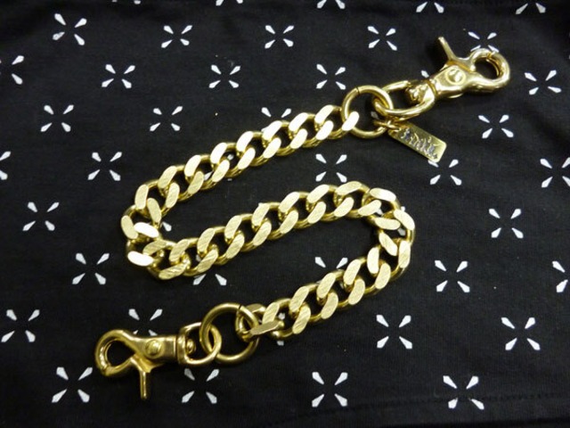 BRASS(真鍮)ショートタイプのウォレットチェーン 真鍮無垢の極太喜平のチェーン使用 全長 約33cm、チェーン部分 約20cm チェーンの幅 15mm オリジナルBRASSチャーム付き MADE IN JAPAN